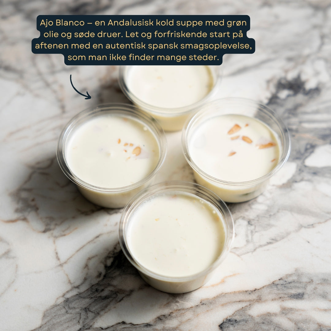 Ajo Blanco — en Andalusisk kold suppe med grøn olie og søde druer. Let og forfriskende start på aftenen med en autentisk spansk smagsoplevelse, som man ikke finder mange steder.