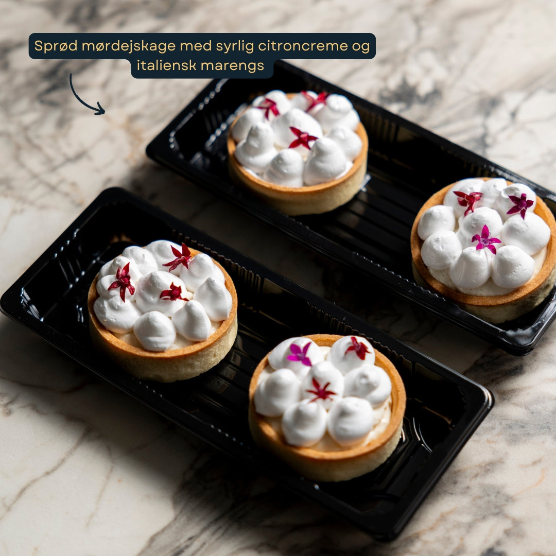 Aftenen afrundes med en sprød mørdejskage med syrlig citroncreme og italiensk marengs — luftig, elegant og den perfekte afslutning på nytårsmenuen.
