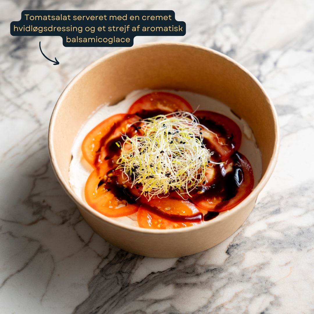 En frisk og farverig tomatsalat serveret med en cremet hvidløgsdressing og et strejf af aromatisk balsamicoglace, som tilsammen giver en lækker balance mellem syre, sødme og fylde.