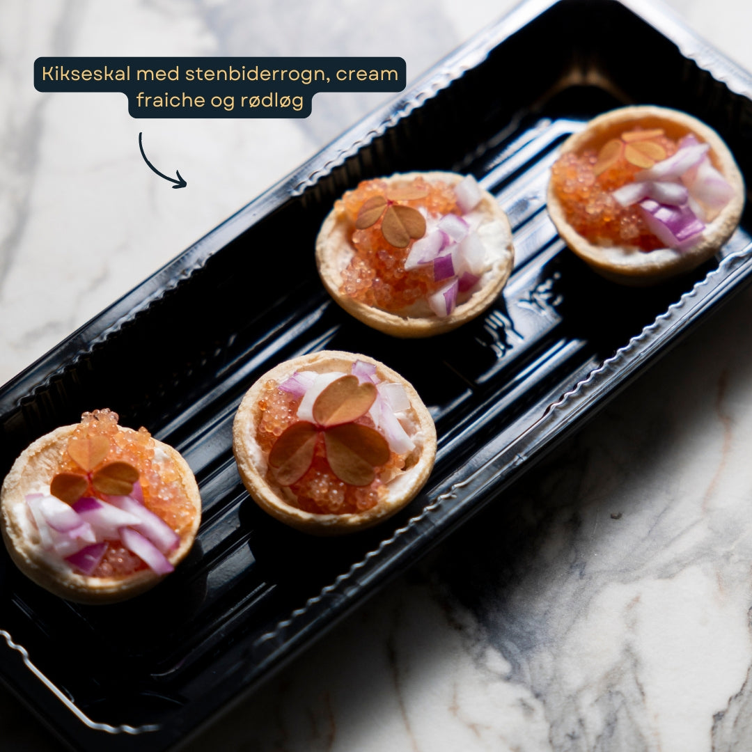 - Kikseskal med stenbiderrogn, cream fraiche og rødløg