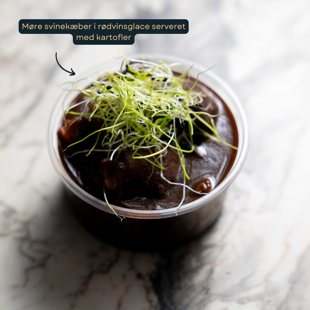 Møre svinekæber i rødvinsglace serveret med kartofler — et varmt og fyldigt indslag midt i aftenen.